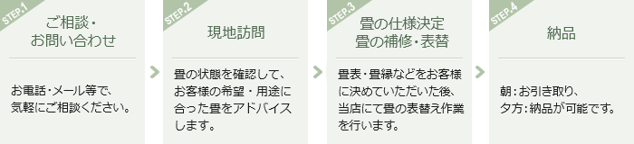 畳の裏返しをしてから、7~8年程度で表替えを行うのが一般的ですが、 住環境や使い方によって短い期間で痛んでしまったり逆に長くお使いいただける場合もあります。畳がへたって凹んできたり、畳の上を歩く時にへこむ間隔がある場合は、畳の表替えでも解消されません。 |